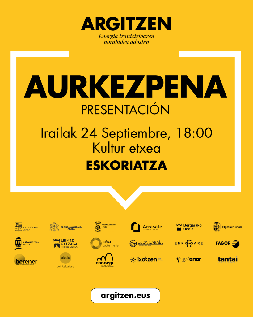 En Eskoriatza se ha organizado una reunión el 24 de septiembre, a las 18:00 en la Casa de Cultura, para presentar y dar a conocer ARGITZEN. Os animamos a participar y a hacer un seguimiento del proceso. ¡Tenemos la oportunidad de dar el color que nos gustaría al futuro!